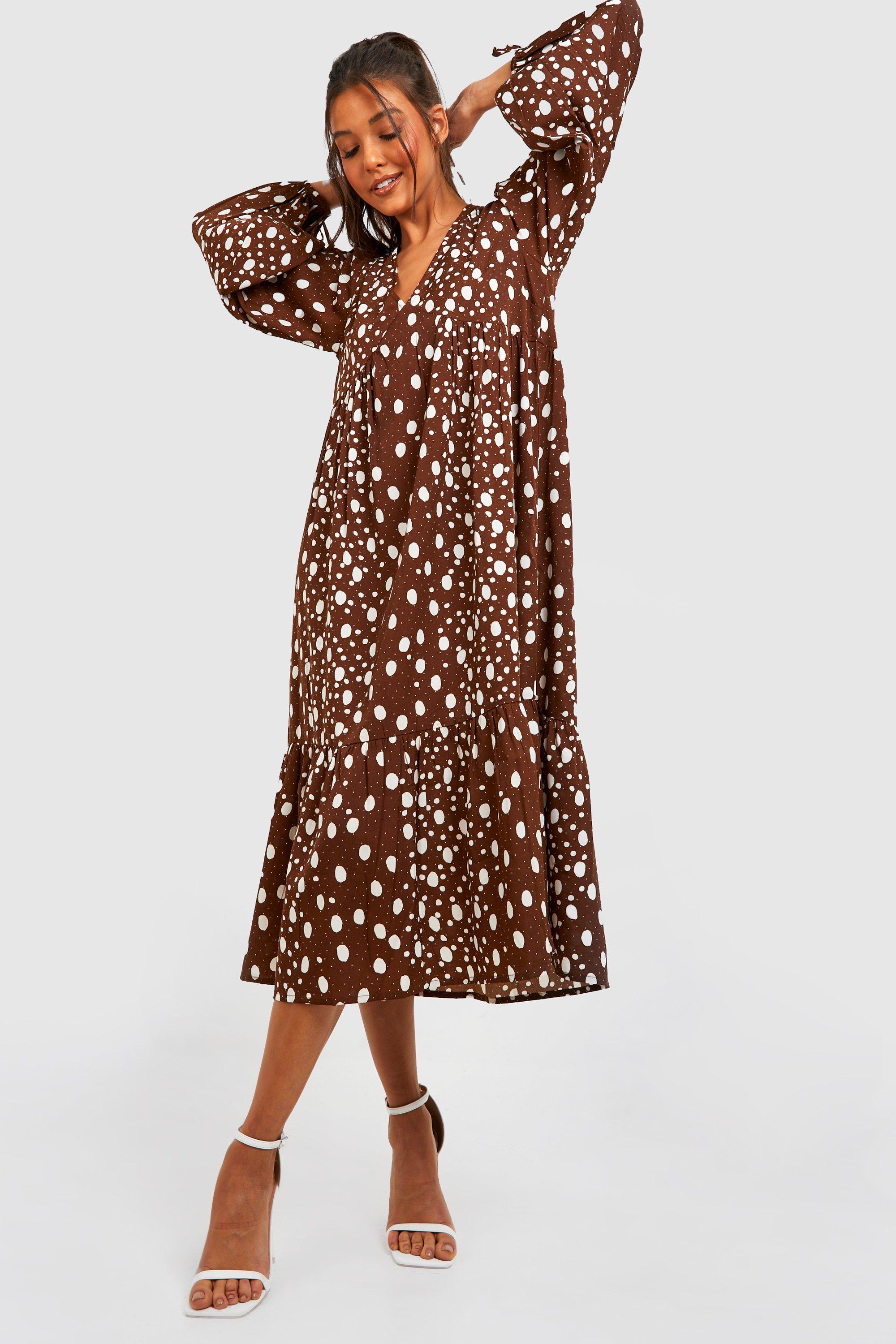 Brown polka dot midi dress sales