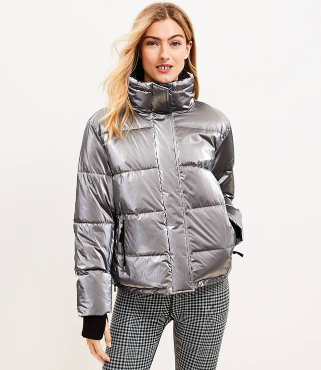 Metallic grey puffer jacket sales