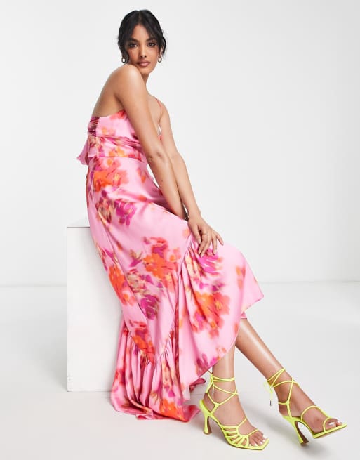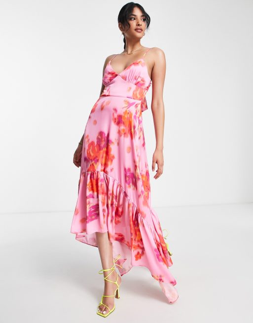 Pink floral asymmetric midi dress sales