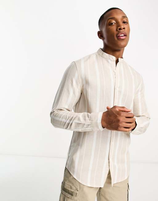 Striped banded collar dress shirt sales