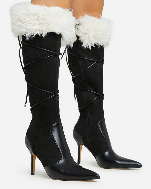 Black knee high boots with fur trim sales